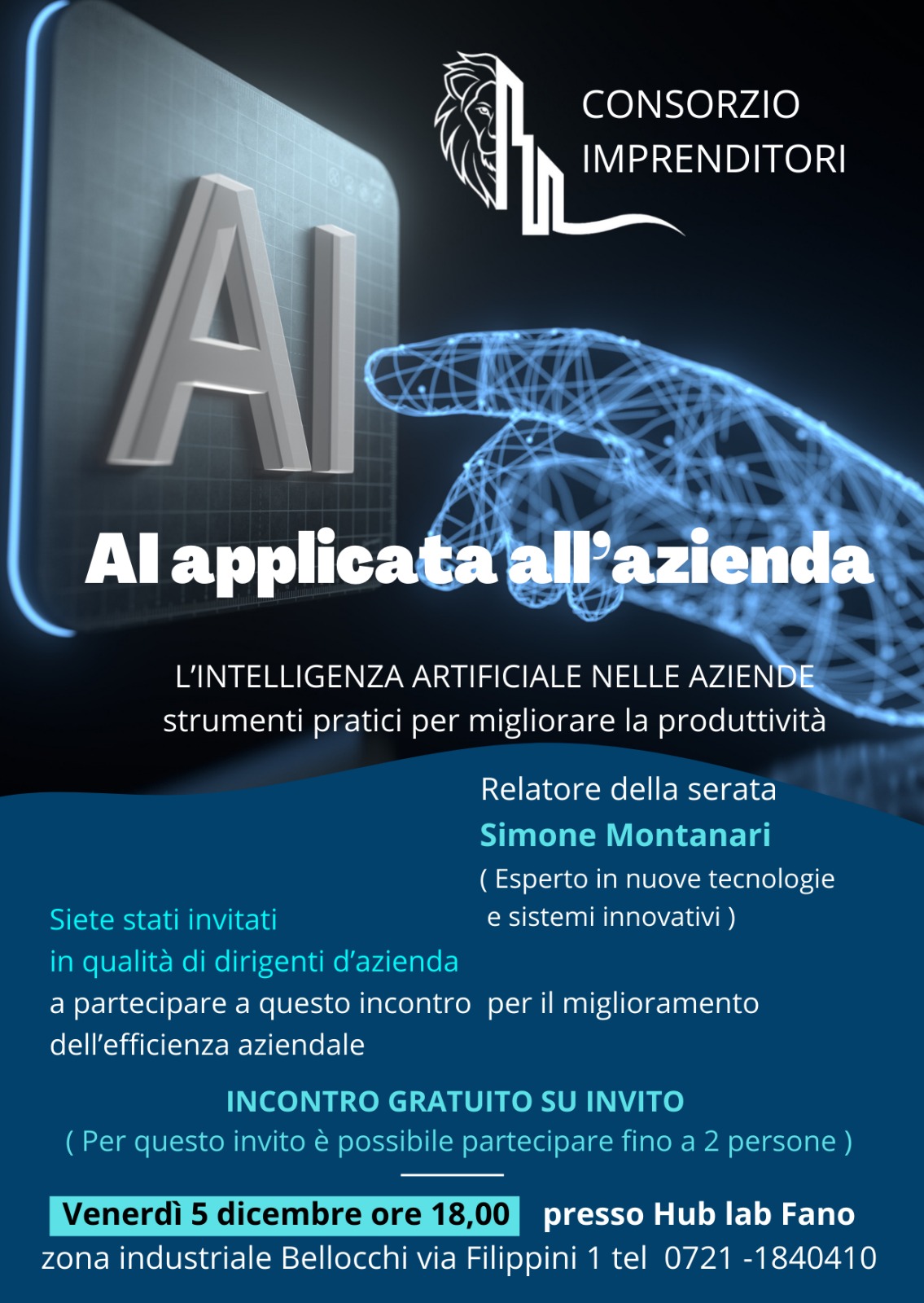 È per rispondere a queste domande che il Consorzio Imprenditori ha organizzato l'incontro intitolato "AI applicata all'azienda", previsto per venerdì 5 dicembre alle ore 18:00.